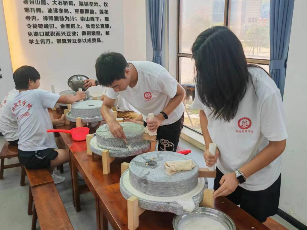 “万亩良田种大豆,百豆百园百示范,涉山涉水做文章,百花百果成百景”,大豆产业是流芳乡传统产业也是特色产业,“同心燃梦”社会实践队深挖流芳豆文化渊源,亲手体验非遗文化石磨豆腐制作技艺,感受中国工匠默默坚守与奉献的宝贵精神,以及中华优秀传统文化旺盛生命力和时代风采。