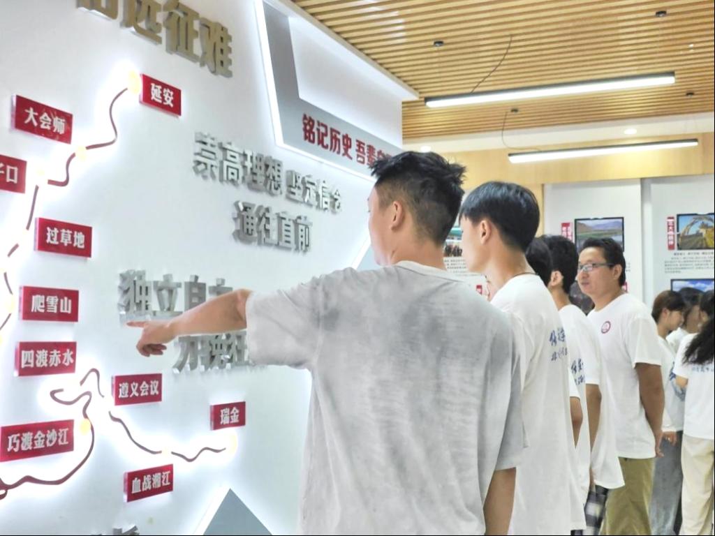 当天上午,实践队成员们首先参观了展馆一楼的“井冈山精神”“伟大长征精神”“延安精神”“西柏坡精神”“改革开放精神”及“抗洪精神”六个篇章。通过指导老师的讲解以及在数字科技手段的生动演绎下,一幅幅生动的战役场景跃然眼前,一个个浴血奋战的画面震撼心灵。队员们仿佛穿越时空,置身于那段艰苦卓绝的长征岁月,深刻感受到了伟大建党精神的不朽。