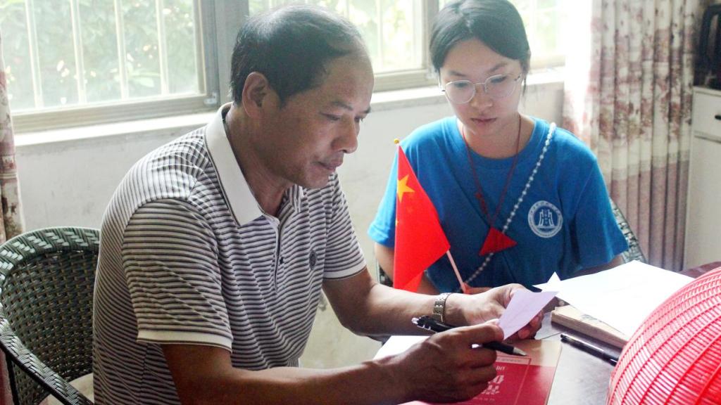 图为:“浔梦杨洲”社会实践队发放调查问卷,并与老人交流。