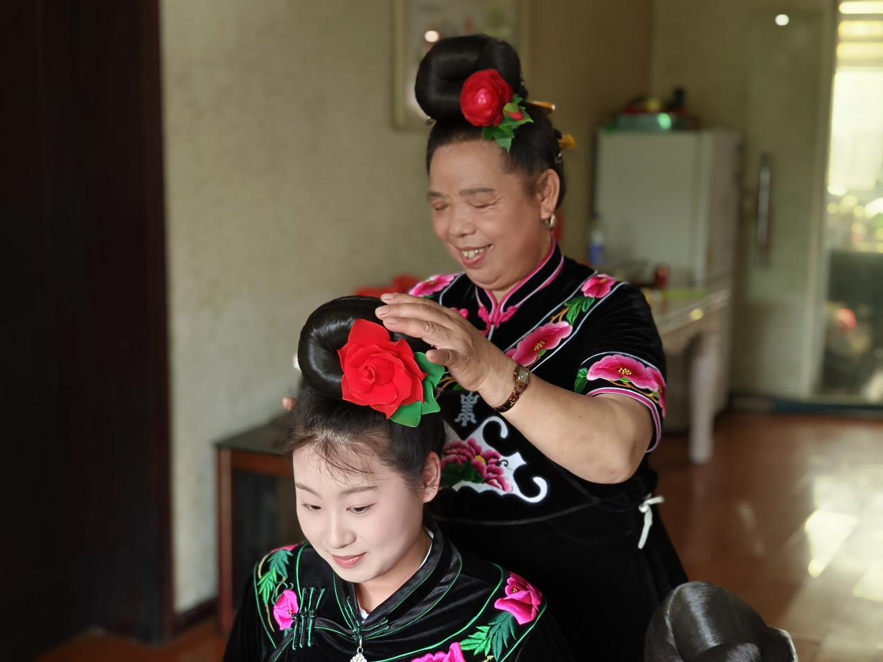 “这是我们苗族的传统,如果你从远方来,那么我一定要招待你到家里喝酒” 我们很好奇她的普通话为什么这么好,原来她曾经当过凯里周边6个自然行政村的医生。行医的岁月里,她亲历着地区普通话推广得越来越好。现在凯里鸭塘镇大多数自然村都能无障碍交流了,“当然了,我们讲话的口音还是有点改不掉。说得不好,说得不好?!彼实匦ψ?。她还给我们团队的小姑娘盘起了苗族发髻,一遍遍梳着都是满满的祝愿。“真好啊,妹妹们,推广了普通话让你们来我家里做客啊。”