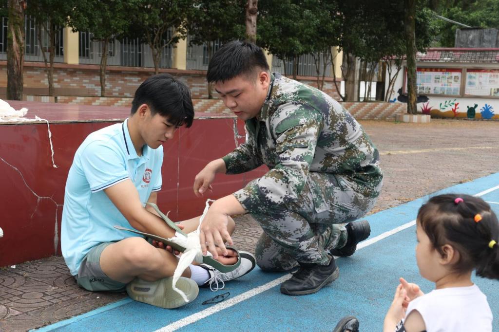 最后,实践队队员黄堃、刘清为同学们演示了受到伤害时的自护自救步骤,以头部受伤及小臂骨折为例,详细讲解了包扎步骤以及需要注意的细节,在实践队队员的引导下,孩子们亲手体验了包扎过程。