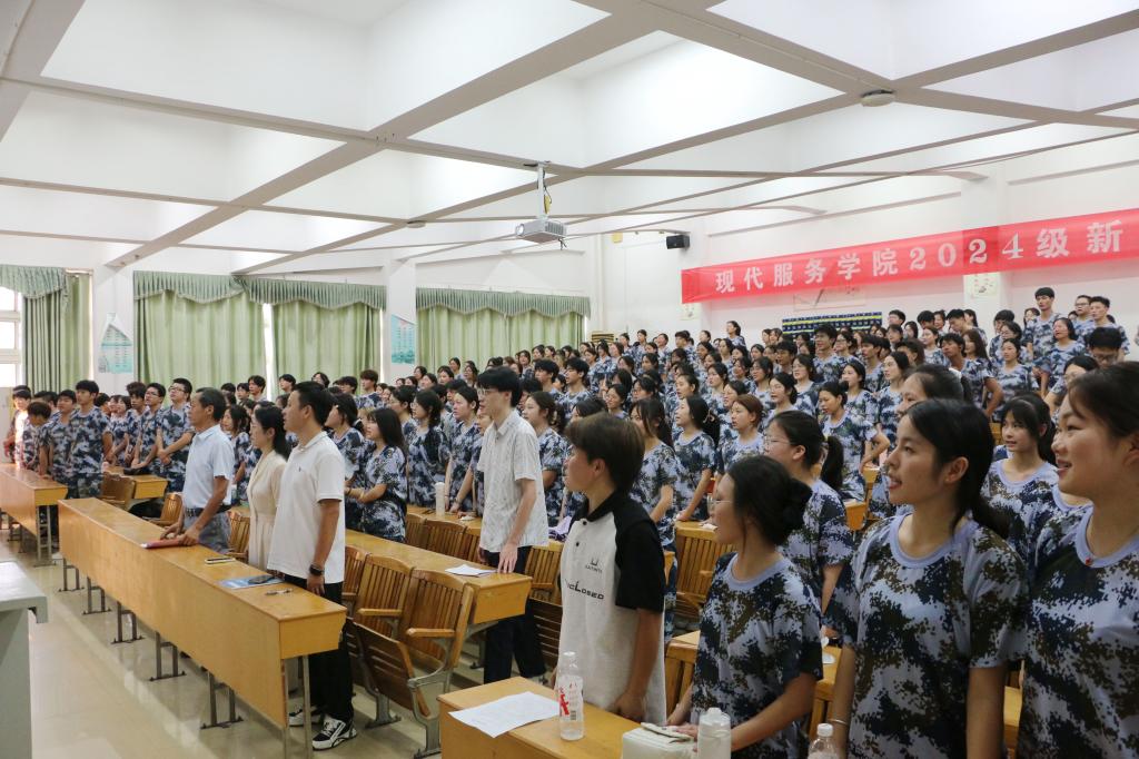 现代服务学院2024级新生开学典礼在“歌唱祖国”的嘹亮歌声中落下帷幕。新生即将开启崭新的大学生涯,同学们表示将抱着热情和决心,带着师长的殷切希望和嘱托,迎接新挑战,创造新辉煌。
