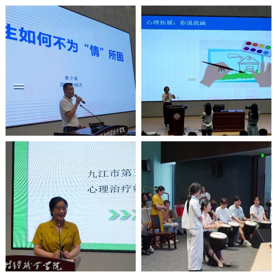 黄少南院长以《大学生如何不为“情”所困》为主题,以生活情景案例为开篇,为大一新生们详细介绍情绪的产生、如何正确地认识情绪、学会情绪自我调节以及如何与人相处和谐,从“想法、行动、学习、心态”四个方面给出指导性建议。团队成员郑朴然以“你说我画”的方式为新生们讲解何谓积极有效的沟通、人际关系对个人的意义、如何利用爱的语言“观察、感受、需要、请求”去建立良好和谐的人际关系。团队成员张伟娟通过诙谐幽默的漫画切入《认识“心理咨询”》主题,让新生们树立了对“心理咨询”的正确认识,同时展示了心理咨询的多元化形式,涵盖“个体咨询”“团体辅导”“沙盘疗法”“绘画治疗”“情绪宣泄”“正念冥想”及“音乐疗法”等丰富手段。团队成员陶晶通过现场教授同学们演奏非洲鼓引领新生们踏入了一场奇妙的心灵音乐之旅,体验了音乐疗法带来的心灵抚慰与力量。在场学生们反响热烈,积极参与互动,不仅掌握了情绪管理、人际沟通的技巧,还树立了对心理咨询的正确认识,为大学生活注入了满满的正能量与希望。