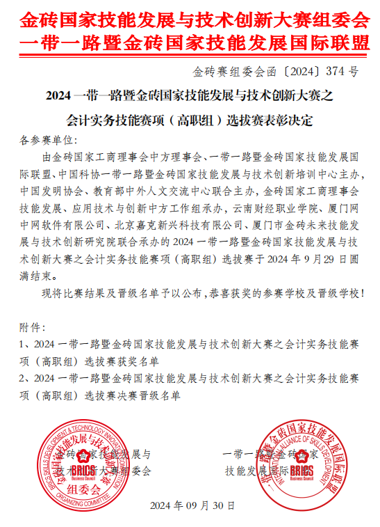2024年9月29日,由金砖国家工商理事会、金砖国家技能发展国际联盟主办,教育部中外人文交流中心、中国发明协会联合主办,厦门网中网软件有限公司技术支持的“2024年金砖国家技能发展与技术创新大赛之会计实务技能全国选拔赛”在线上成功落幕。当天来自全国的660多支高职队伍参加了云端赛事,经过一天紧张激烈的比赛,由我?;峒蒲г河嚓臀?、黄玲老师指导,叶尔芳、刘厚松、宋悦和张奥同学组成的代表队荣获团体一等奖第1名的优异成绩,吴玟、杨子璇、徐月蓉、黄榕组成的代表队荣获一等奖第4名,两位教师荣获“优秀指导教师”称号。