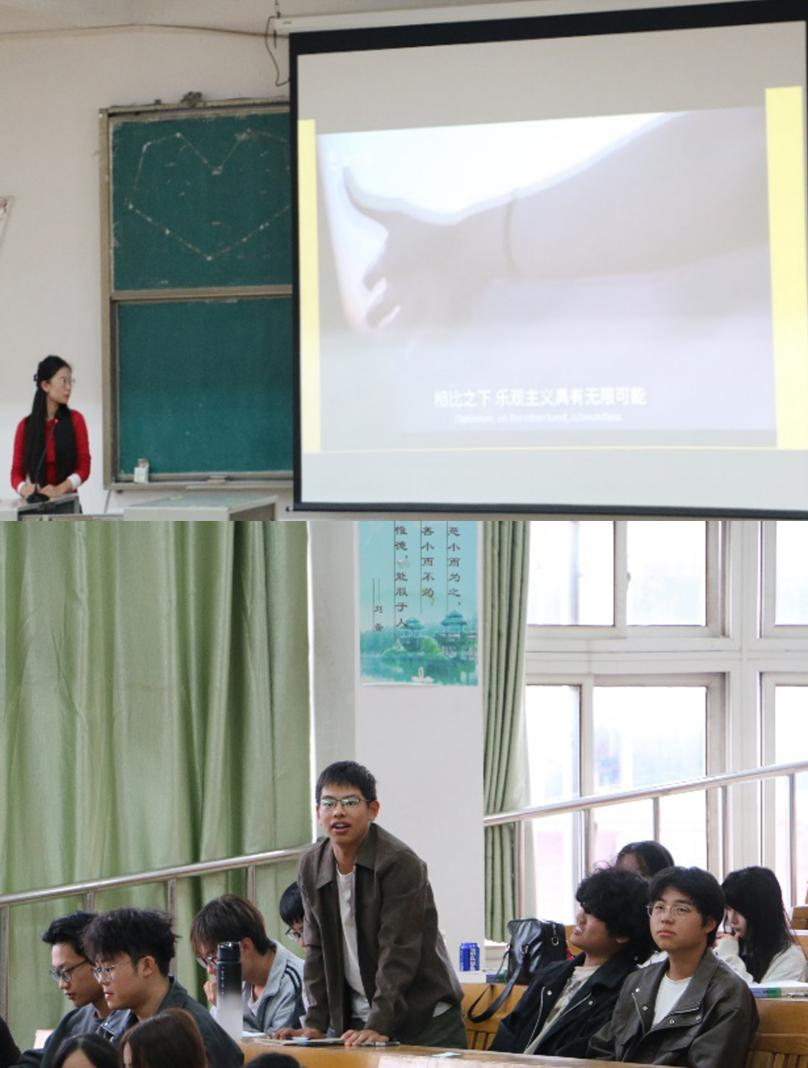本次活动旨在提升大学生对于心理健康的认知,更为大家提供了一个交流与分享的平台,共同探讨如何在快节奏的生活中守护心灵绿洲。曾征不仅积极倡导自我心理健康的关注,还鼓励大家将这份关怀延伸至他人,共同营造一个温馨和谐的心理环境。讲座中,曾征紧扣学生关注的热点话题,运用视频教学这一生动形式,打开了学生们的心扉。同学们纷纷主动分享自己在日常生活中遇到的积极经历,欢声笑语充盈着整个教室。借此良机,曾征引导同学们以笔为媒,记录下自己的闪光点,用正面的语言为自己加油打气,并在“心理健康宣言留言板”上郑重写下对未来心理健康生活的美好憧憬与承诺。