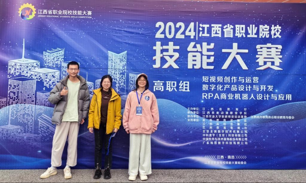近日,2024年省职业院校技能大赛高职组“数字化产品设计与开发”赛项在江西泰豪动漫职业学院成功举办。全省共计28所职业院校参加此次大赛,经过紧张而激烈的角逐,由我校信息工程学院冷晨曦、姜蕴莉老师指导的黄屹扬、刘明燕、陈海燕同学获得该赛项一等奖。