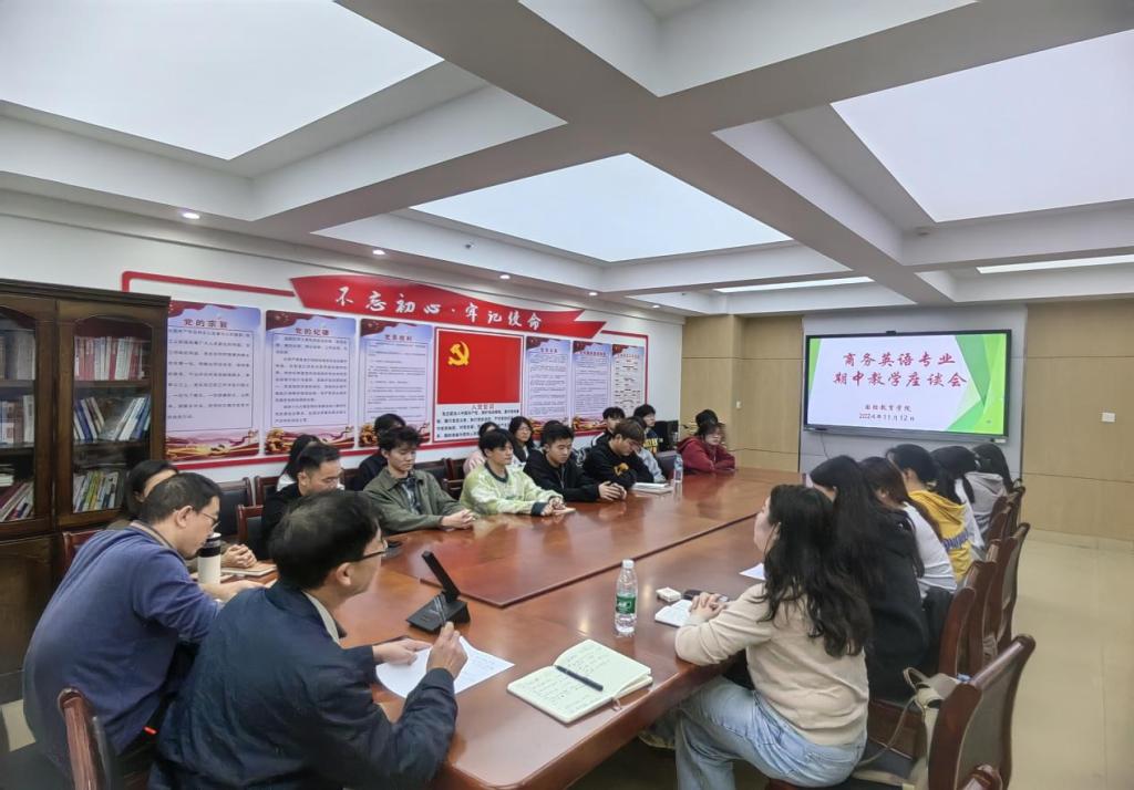 为进一步规范教学管理,加强教学过程质量监控,切实提高教学质量,落实学?!督萄е柿克嵘桨浮返牟渴?,国际教育学院于11月12日下午在浔阳校区综合楼918会议室召开了商务英语专业期中教学学生座谈会。