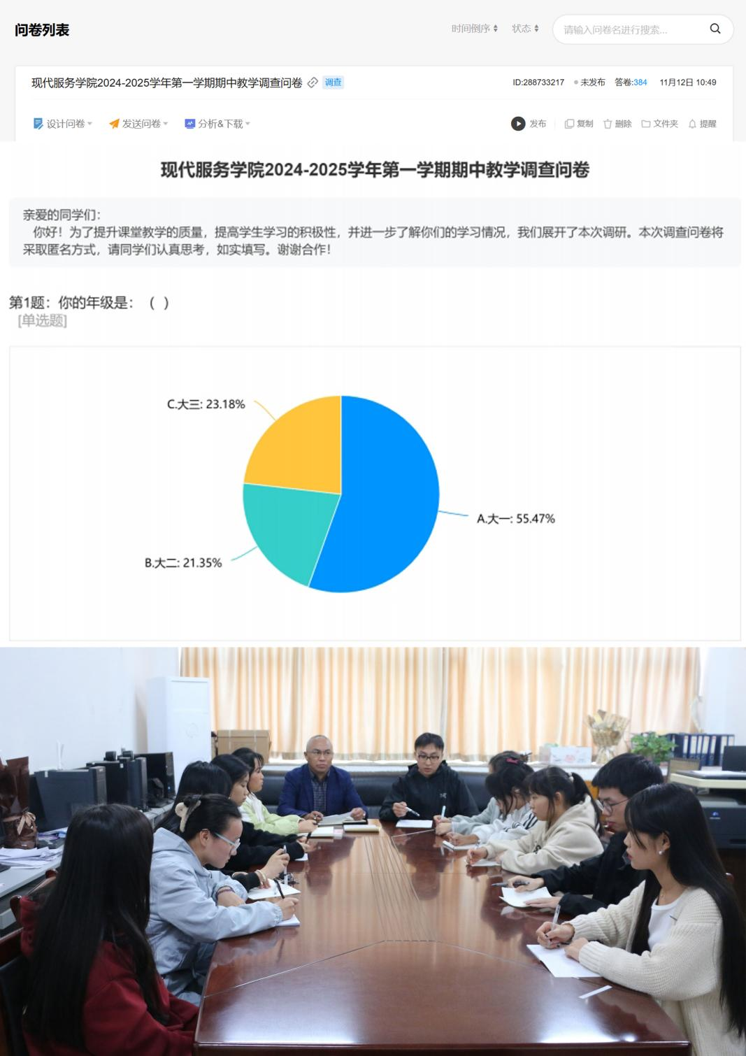 为进一步提升教学质量,优化教学模式,强化教学管理,本科部(现代服务学院)于11月中旬完成了本学期期中教学检查,包括随堂听课、匿名网络调查及座谈会等活动。这一检查旨在全面了解师生的教学需求与反馈,以便学院能够及时发现问题,采取相应措施,推动教育教学工作的持续改进。