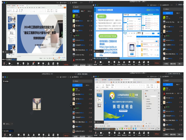 本次赛项说明会采用线上会议形式,由城乡建设副院长吕亨龙主持。参加赛项说明会的人员有协办单位井冈山大学吴老师、赛项专家组长、各参赛院校指导老师和参赛学生以及企业支持单位广联达、品茗、斯维尔三家企业技术代表。