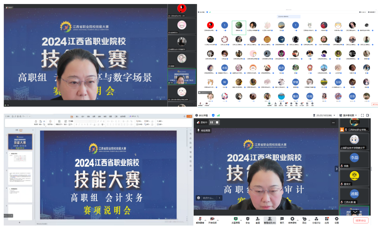 为确保2024年江西省职业院校技能大赛高职组会计实务赛项、云财务共享与数字场景应用技能赛项和智能审计赛项顺利进行,江西财经职业学院于2024年11月27日-28日分别召开赛项说明会。本次会议采用线上方式在腾讯会议室举行,由会计学院院长万凯教授主持,协办校领导、赛项专家、各参赛队领队、指导教师、承办校代表、技术支持单位代表准时参加会议。