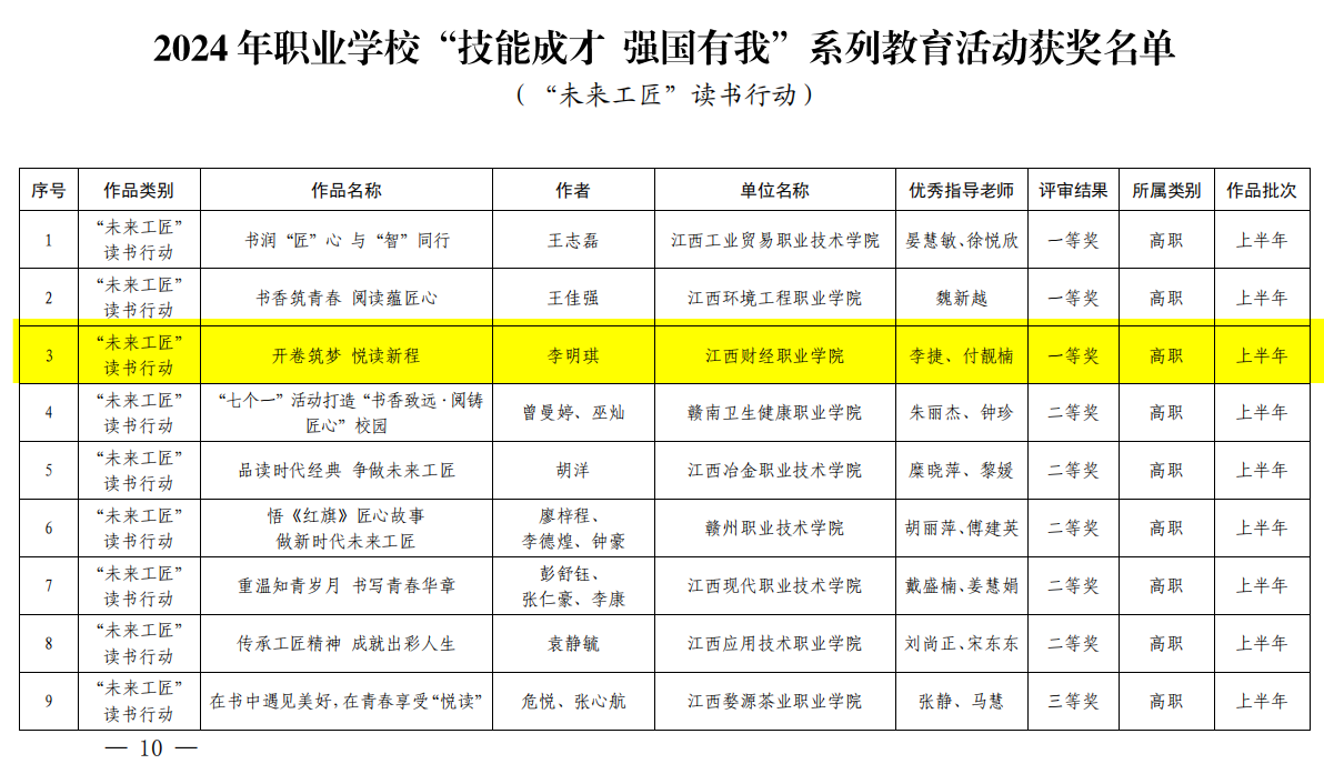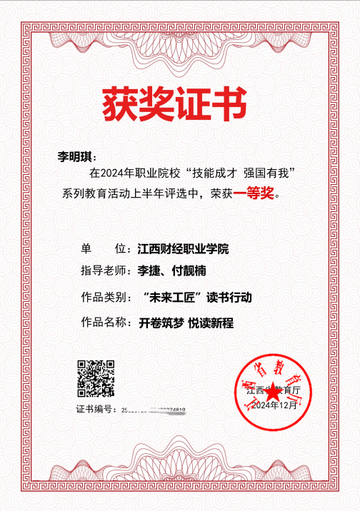 此次系列教育活动按照上半年、下半年作品上报情况,由江西省教育厅分别组织专家对作品进行评审。经过评审,城乡建设院李捷和付靓楠老师指导,李明琪同学上报的作品《开卷筑梦 悦读新程》获得“未来工匠”读书行动一等奖。