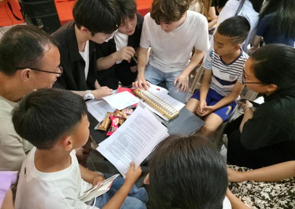 比赛结束后进入交流互动环节。中方同学向外国友人和现场小朋友详细介绍算盘的构造、原理和使用方法,参与者们认真聆听、踊跃尝试,在噼啪作响的算珠声中感受千年智慧结晶。现场氛围热烈融洽,不少外国友人经过指导后已能完成基础运算。
