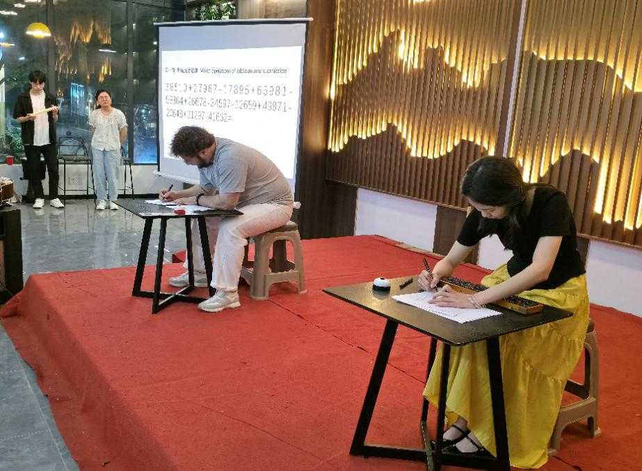 活动高潮出现在珠算直播PK环节。中方同学与外国友人展开激烈较量,外国友人使用笔算,中方同学则运用传统算盘。比赛分三轮进行,前两轮分别为加减法和乘除运算。凭借扎实的珠算功底,中方同学在这两轮中均取得胜利,充分彰显了传统珠算技艺的独特魅力与强大实用性。