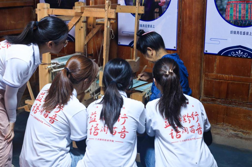 苗锦是中华灿烂织锦文化的有机组成部分。实践队拜访了苗族织锦技艺国家级代表性传承人潘英,深入学习这项非遗技艺。潘老师向队员们展示了精美的织锦作品,上面的蝴蝶、祥文等图案栩栩如生。她特别拿出一件珍贵的传家宝:“这是我奶奶年轻时亲手织的,已经有120多年历史了。从种棉、纺线到染色织造,每道工序都是奶奶亲手完成的。”在古朴的织机前,潘老师娴熟地示范织锦技法,双脚灵活踩踏,双手快速穿梭。跃跃欲试的队员们初次尝试时却手忙脚乱,丝线很快缠成一团。潘老师立即上前指导:“握梭要稳,穿梭要准,还要注意观察经线排列?!本托闹傅?,队员们慢慢体会到这项非遗技艺“慢工出细活”的真谛。