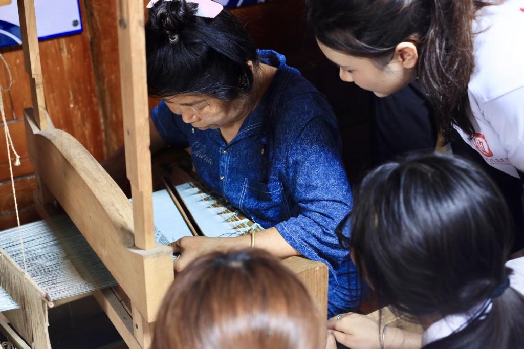 在苗族织锦技艺国家级代表性传承人潘英奶奶家中,实践队员们认真记录着织锦纹样背后的文化密码,并以“非遗微课堂”为载体,录制普通话讲解视频,将苗族织锦十二道工序与历史故事娓娓道来,让织锦技艺通过数字媒介走向大众视野。同时,实践队将江西瑞昌非遗剪纸与苗侗文化创新融合??翁蒙?,队员们变身“非遗讲师”,用普通话讲解剪纸作品中的吉祥寓意,手把手演示汉字的字形剪裁技巧。这种“非遗技艺+语言教学”的创新模式,既让普通话成为文化传承的桥梁,也为乡村振兴注入了新的文化动能。