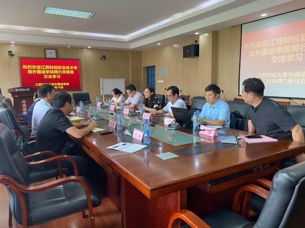 7月16日,外国语学院负责人带领学院党政办公室主任、各教研室主任一行五人前往江西财经大学外国语学院进行学习交流。江西财经大学外国语学院院长张曦凤教授、副院长张善军教授、商务英语系主任肖锐博士、副主任王力媛博士以及大学英语一部主任杜景平博士、实训中心主任常进老师给予了热情接待与交流。