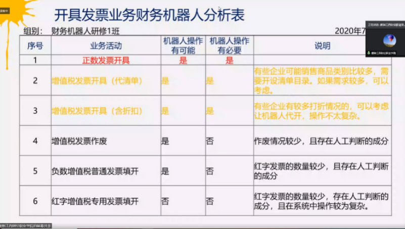 为进一步做好信息化时代会计类专业人才培养改革,2020年7月至8月,会计第一学院唐琳、席伟明,会计第二学院张卉、饶竹芸四位教师先后参加了由北京财贸职业学院、北京融智国创科技有限公司举办的《财务机器人应用与开发》高级研修班。