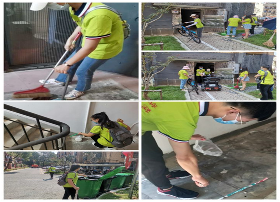 实践活动中,青年志愿者们深入到每栋楼层,清除牛皮癣, 清理散落垃圾烟头、宠物粪便,劝导不文明养犬行为,劝导打喷嚏不掩口鼻行为,规范垃圾桶成对摆放、盖盖子,引导各类车辆在划线区域内有序停放,清理楼道杂物,劝导私拉电线等不文明行为。