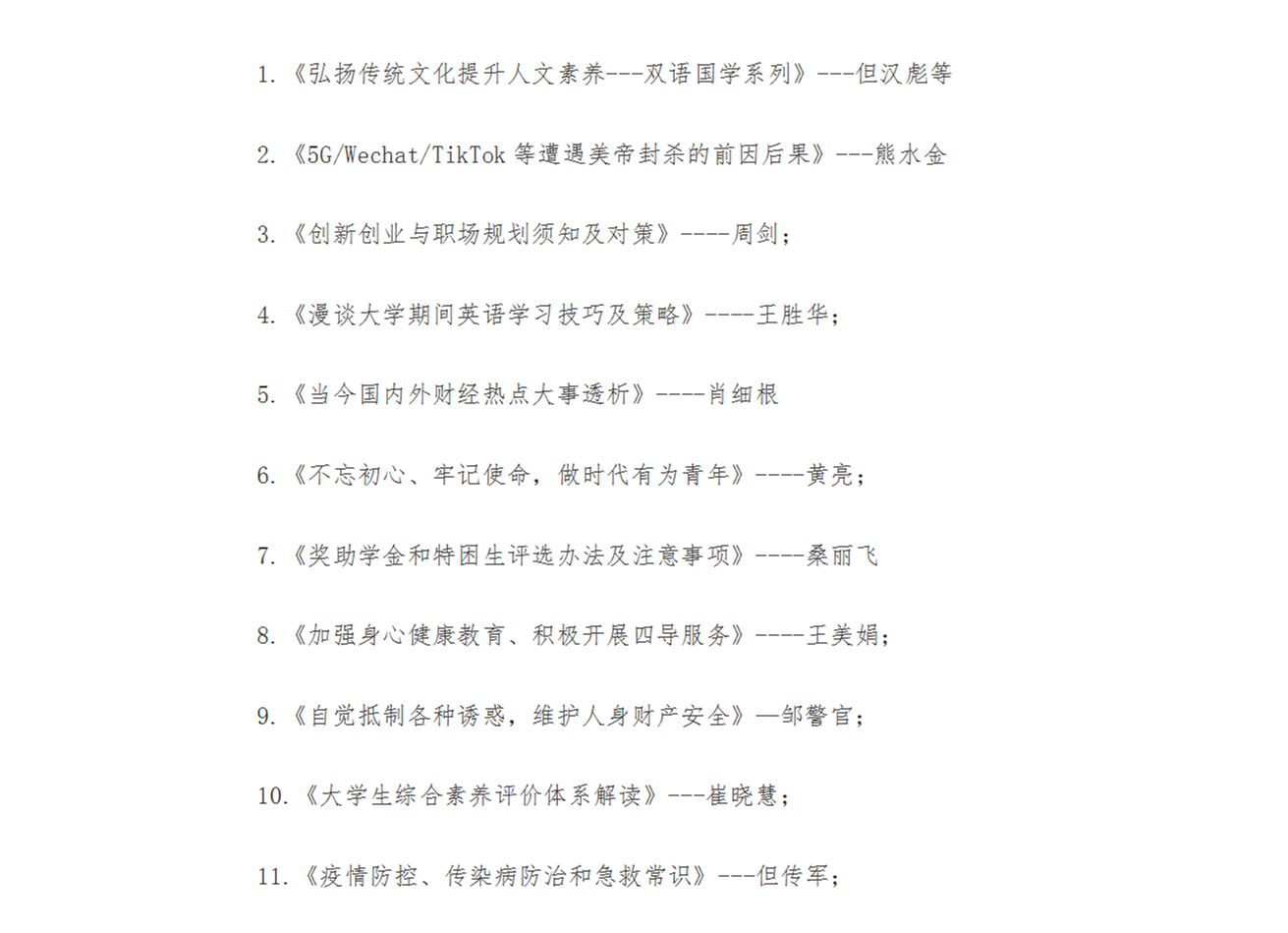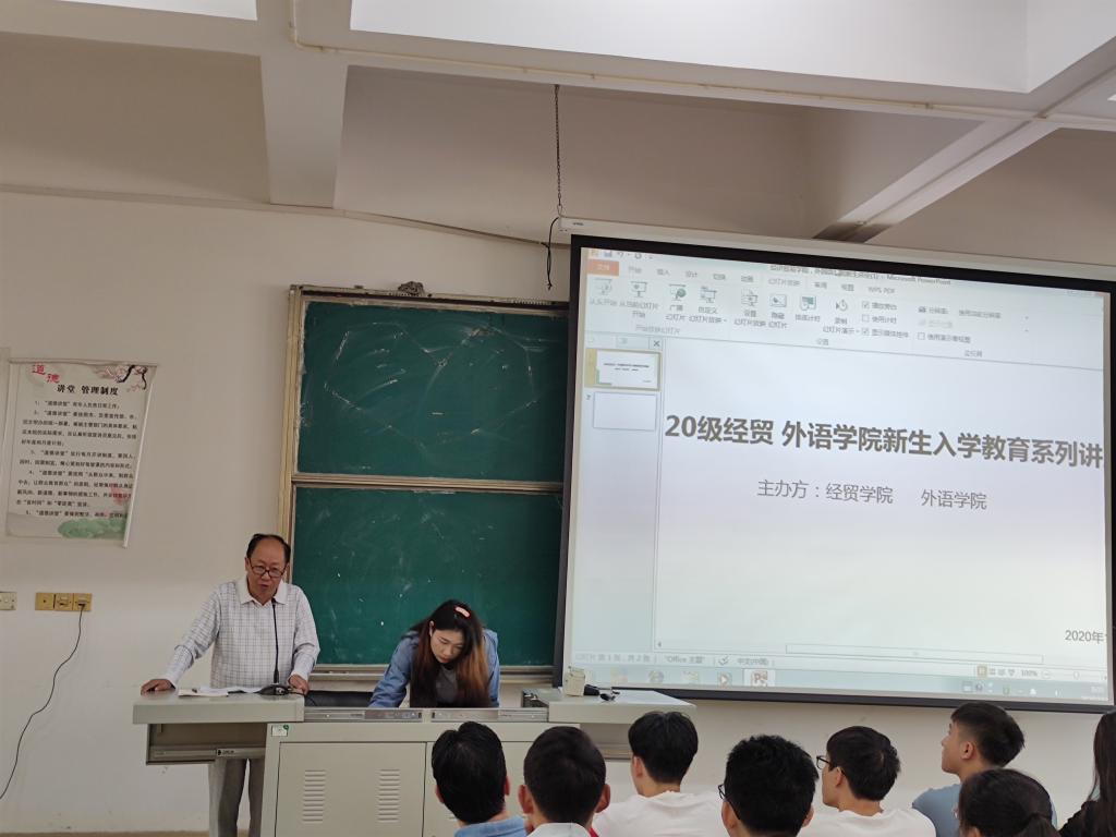 为做好2020级新生入学教育工作,增强学生综合素养,引导新生坚定理想信念、树立远大目标,尽快适应大学生活,经济贸易学院联合外国语学院经过精心筹备,开展了对两院540名2020级新生的为期一周的集中授课。此次教育活动邀请了行业专家、学校部门领导、资深教师等设计了11个讲座,内容涉及到安全、疫情防护、资助工作等方方面面。