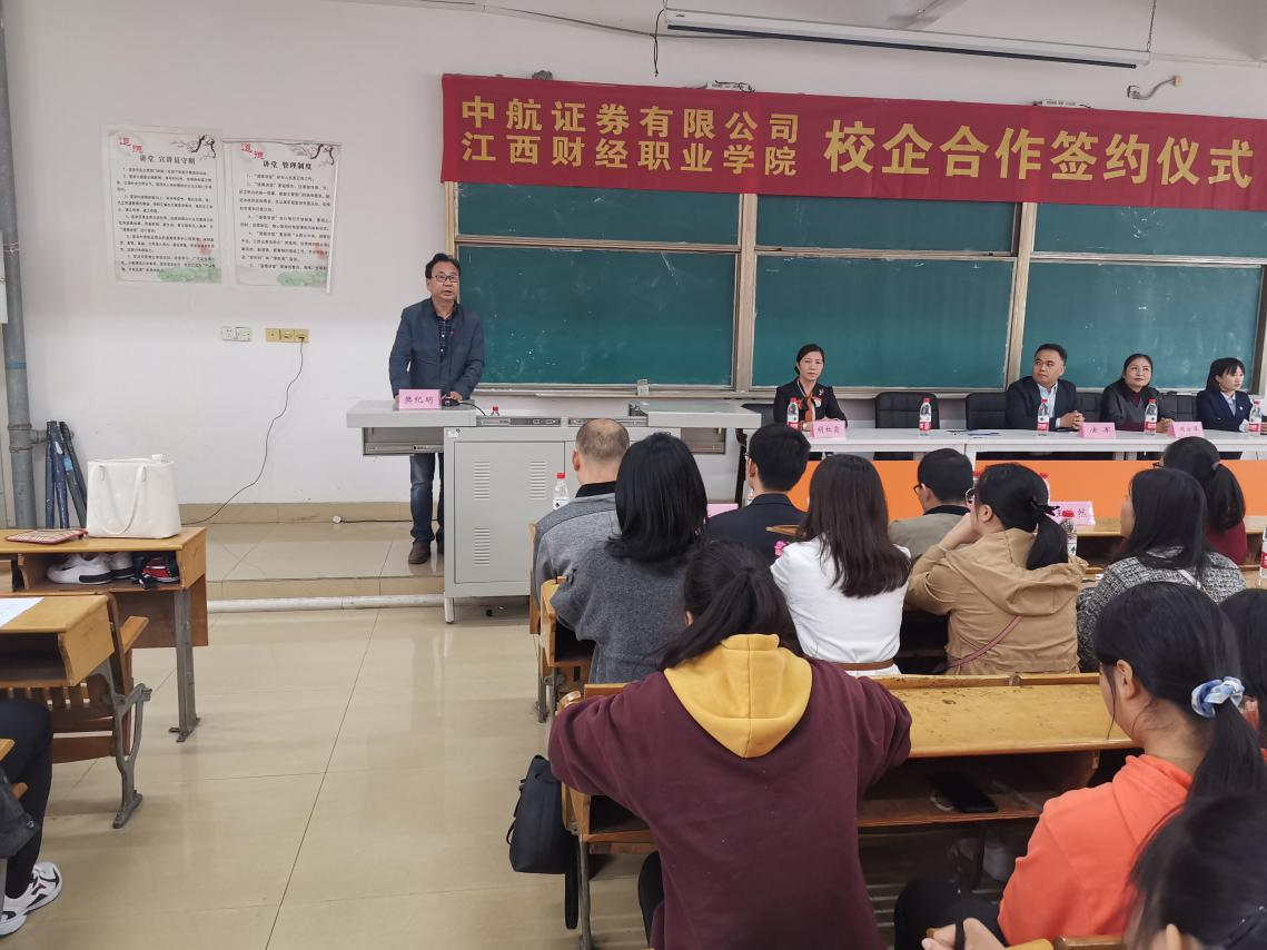 10月25日下午,我院与中航证券有限公司在校综合楼综阶六教室举行校企合作签约仪式。出席签约仪式的有中航证券有限公司南京分公司总经理唐军、投教中心负责人蔡颖、九江营业部总经理周亦萍及公司其他管理人员,学院樊纪明院长、胡红霞书记、王怡然副书记及学院其他教师。仪式由梁丹老师主持,金融管理、保险、投资与理财、证券与期货、互联网金融专业学生参加签约仪式。