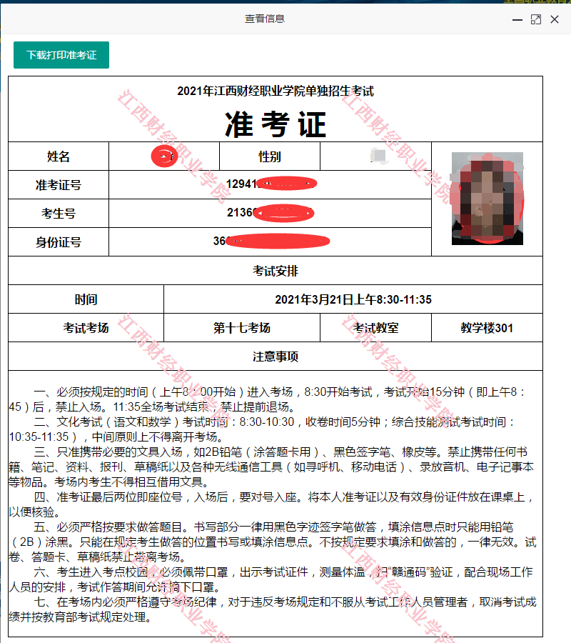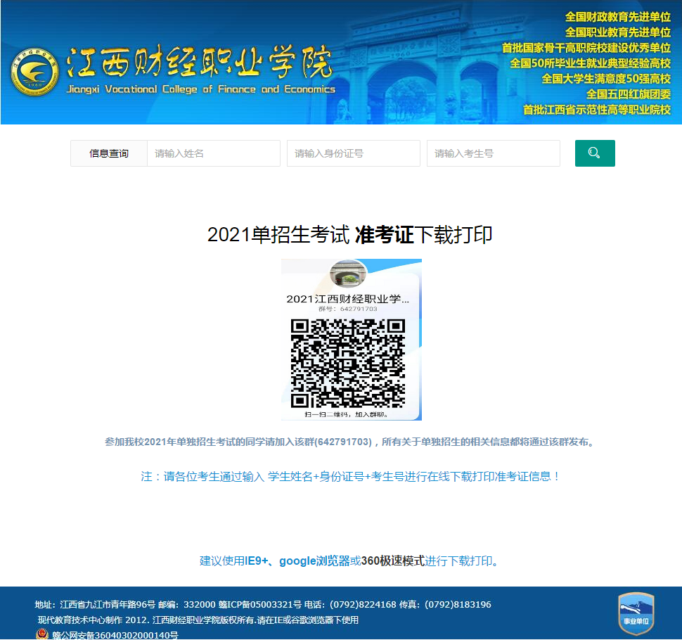 一、 进入我校网站http://www.mbylp.cn/,点击红色移动图标“2021年单独招生准考证打印”(http://welcome.jxvc.jx.cn/xg/dzxx/info/dzsearch)