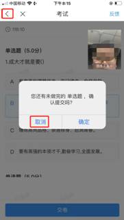 5.考生点击最下方的“交卷”按钮,若存在未作答题目,系统会有相关提示,请选择“取消”并退回至整卷浏览补充作答,确认无误后,并确认提交。