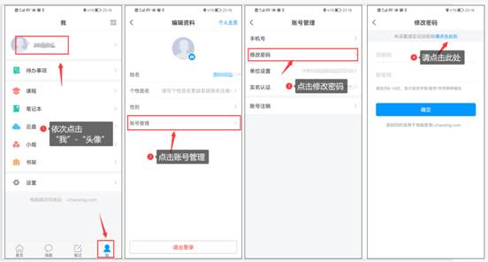 (2)登录后,修改密码操作如下图。依次点击“我”——个人头像——“账号管理”——“修改密码”——“请点击此处”,按提示修改密码。