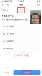 4.开始答题和交卷:每道题点击自己选择答案对应的选项即可(选项加深),点击右下角“下一题”继续作答;到最后一题时系统会提示“已经是最后一题了”,可点击答题界面中间考试位置下方的“答题卡”区域进行整卷浏览,深色的为“已答试题”,浅色的为“未答试题”,可选择任一未答题目来作答,也可选择任一已答题目来修改答案,考生确定没问题后可点击“下一步”进行答题情况核查,左上角有本场考试倒计时。