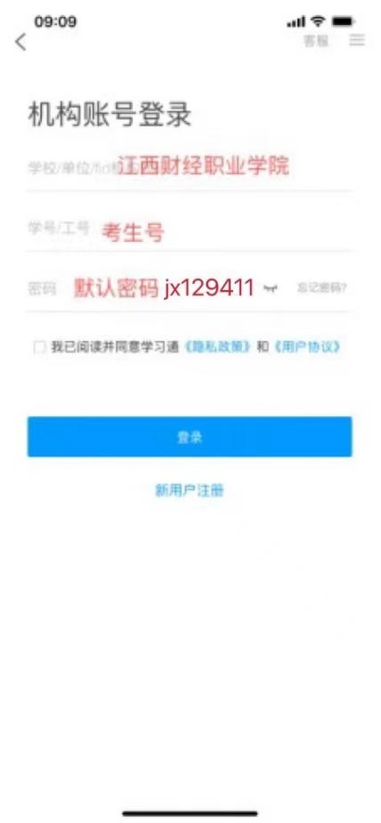 1)打开学习通,在登录界面选择“其他登录方式”,依次输入“江西财经职业学院”、“考生号”、“jx129411”,勾选“我已阅读并同意学习通《隐私政策》和《用户协议》”,再点击“登录”。