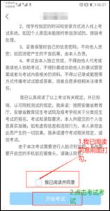 1.点击“考试”按钮,阅读并同意考生承诺后进行打钩,点击“开始考试”,请提前将手机设置为勿扰模式,切屏超过次数和时长将视为作弊。