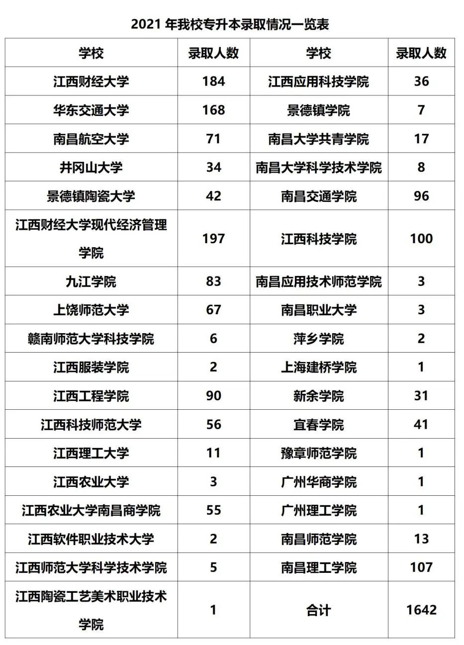 我校2021年参加专升本考试的毕业生为2100人,最终被江西财经大学、江西农业大学、华东交通大学、南昌航空大学、江西科技师范大学等省内各普通本科高校录取共计1642人,录取率高达80%,录取人数再创历史新高,升本人数和升本率位居全省前列。