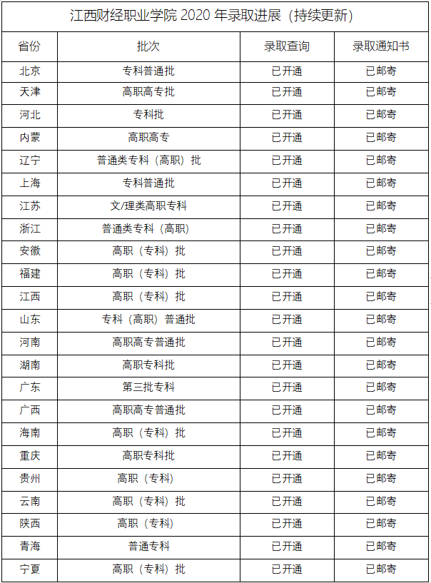 自八月起,我院招就处便进入了紧张的招生录取阶段,截至2020年9月15日,我院已完成以下省份批次的录取,考生可凭各自的考生号或身份证进行录取情况及录取通知书的查询。未开通查询的省份考生请耐心等待,录取工作正在持续推进中。