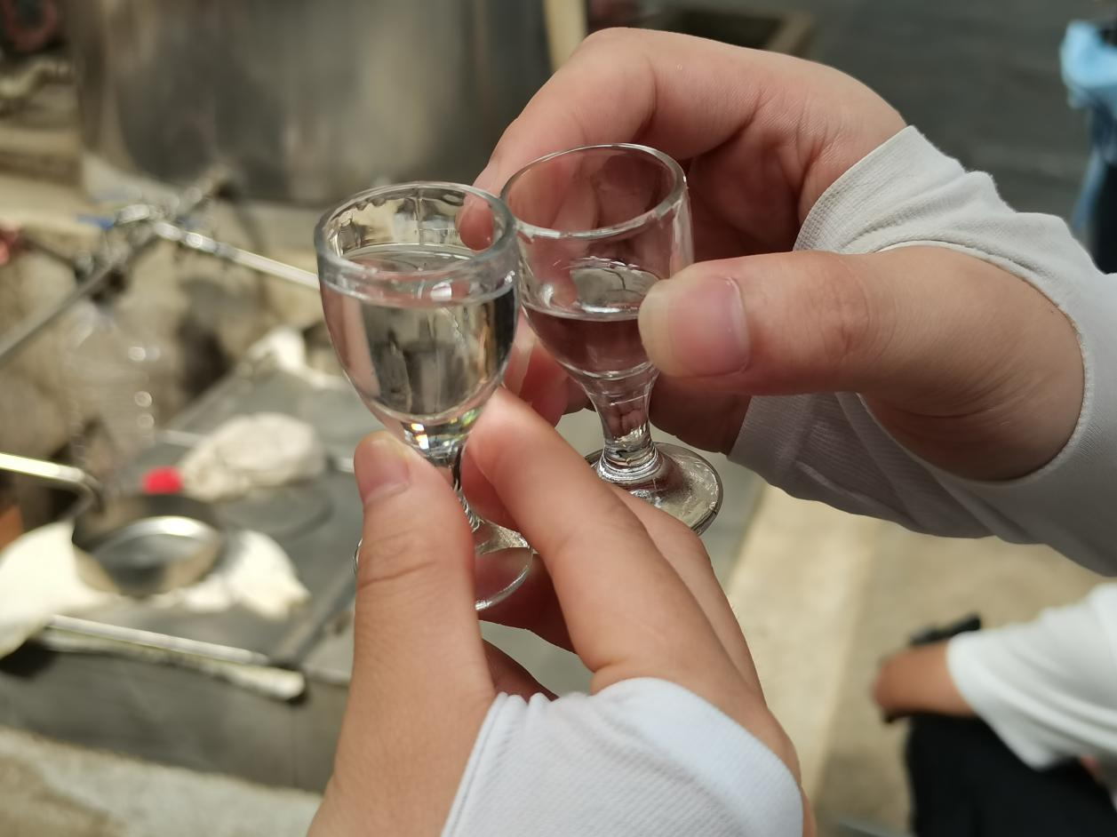 图为队员品尝山药酒。中国青年网通讯员 龚尔洁 摄