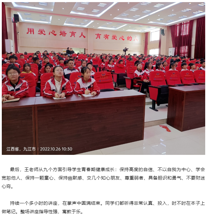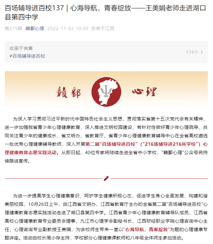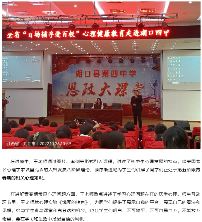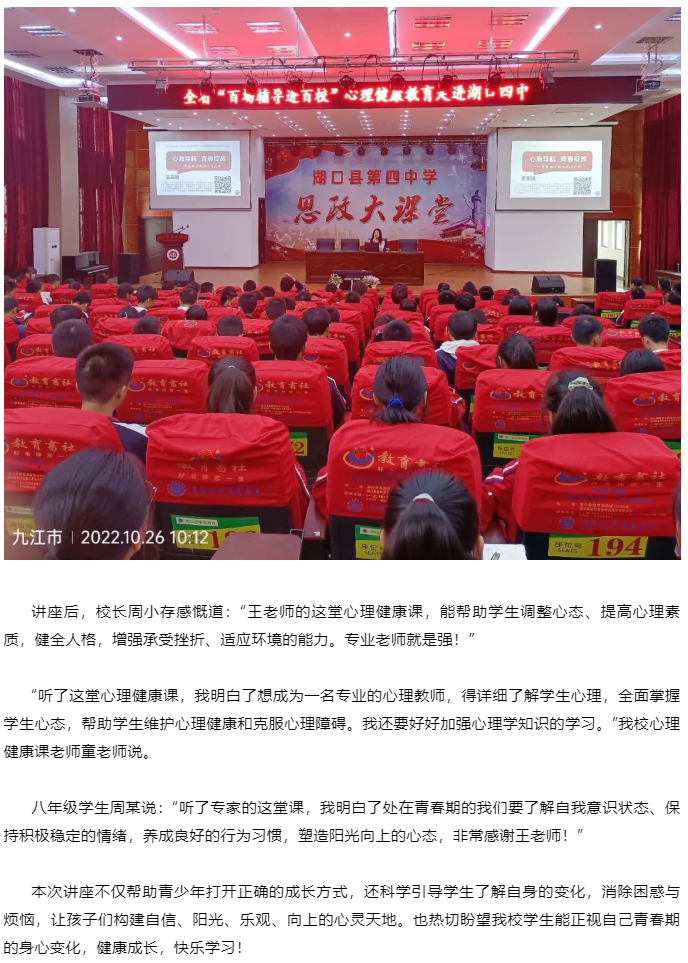赣鄱心理:百场辅导进百校137 | 心海导航,青春绽放——王美娟老师走进湖口县第四中学