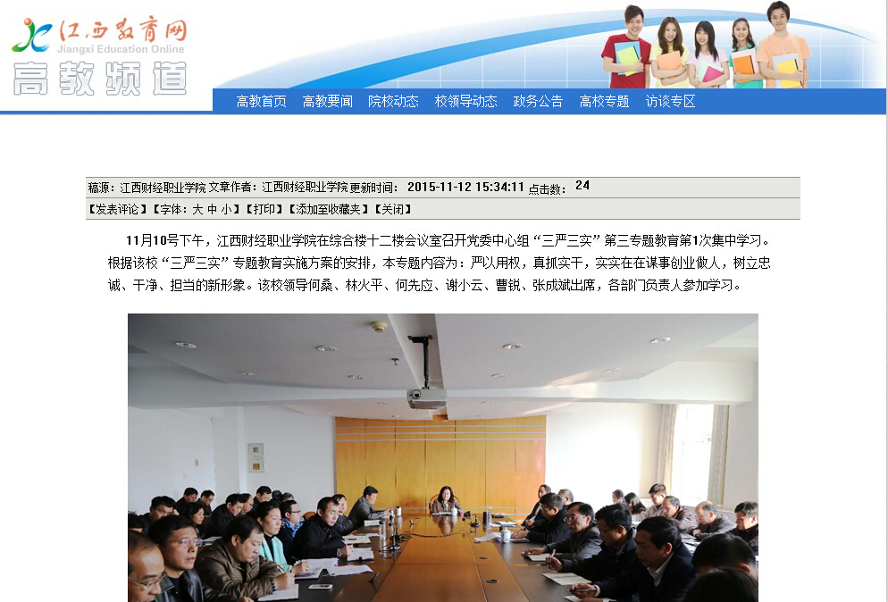 11月12日,省教育厅网站报道我校党委中心组召开“三严三实”第三专题教育集中学习会。