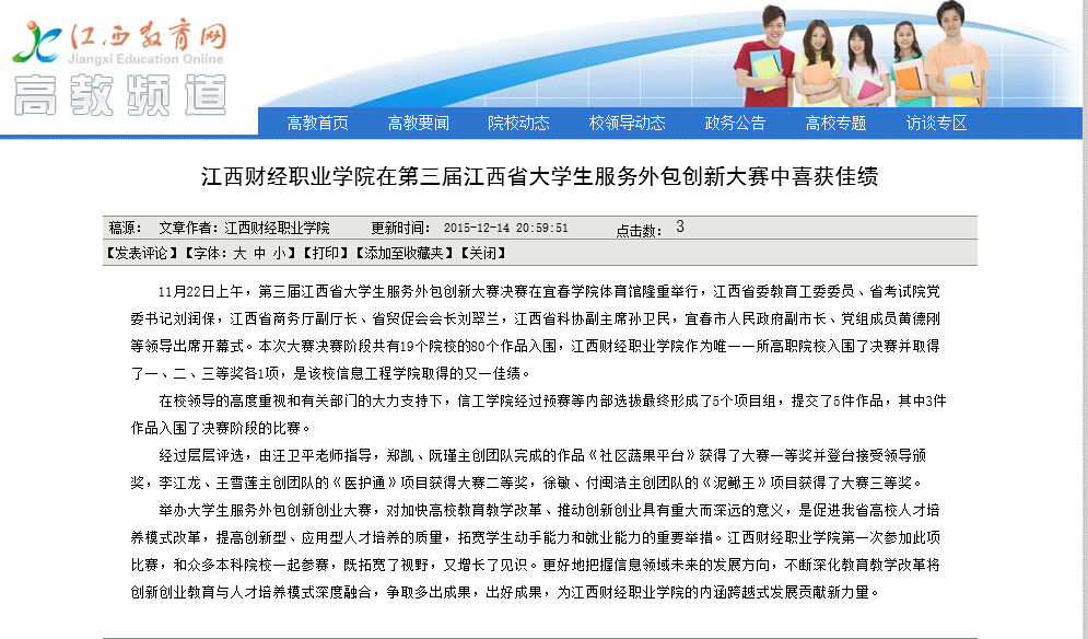 12月14日,省教育厅网站报道我校在第三届江西省大学生服务外包创新大赛中喜获佳绩。