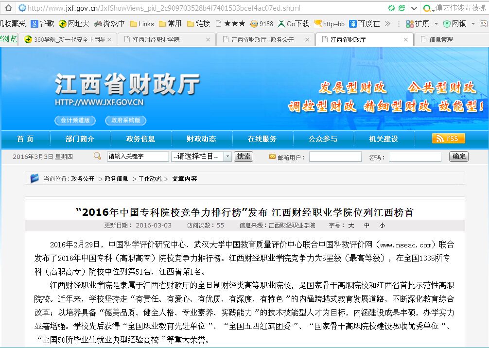 3月3日,江西省财政厅网站报道2016年中国专科院校竞争力排行榜排名情况,我校在排行榜上位列全国第51名,江西省第1名。