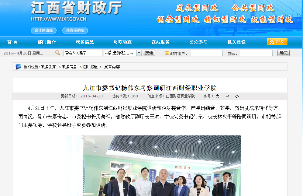 4月23日,省财政厅网站报道九江市委书记杨伟东到我??疾斓餮小?/font>