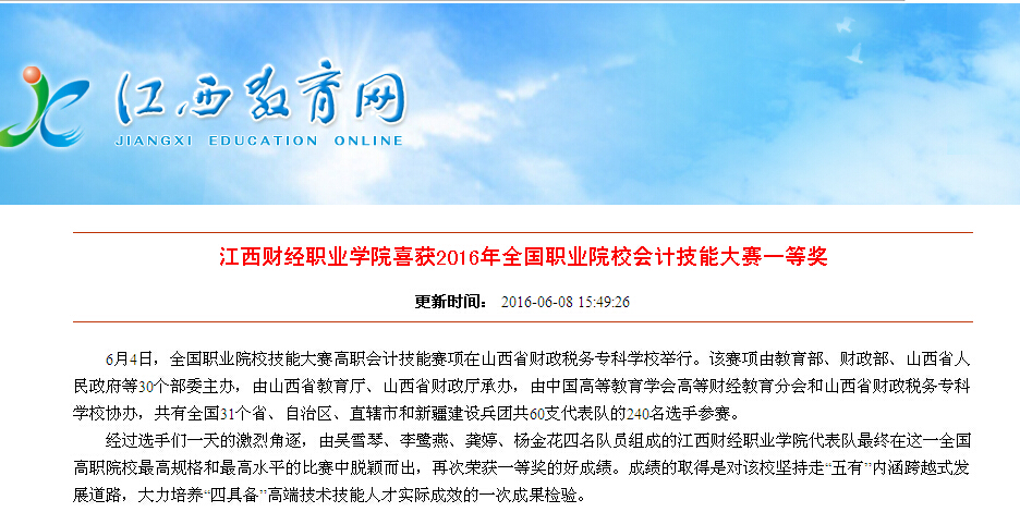 6月8日,江西教育网报道我校喜获2016年全国职业院?;峒萍寄艽笕坏冉?。
