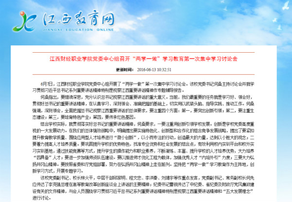 6月13日,江西教育网报道我校党委中心组召开“两学一做”学习教育第一次集中学习讨论会。