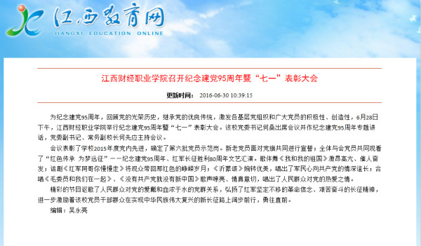 6月30日,江西教育网报道我校召开庆祝建党95周年暨“七一”表彰大会。