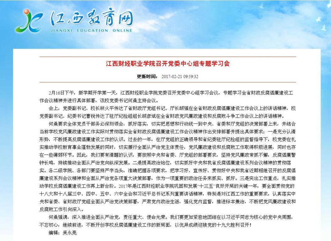 2017年2月21日,江西教育网报道我校党委中心组召开党风廉政建设专题学习会情况。