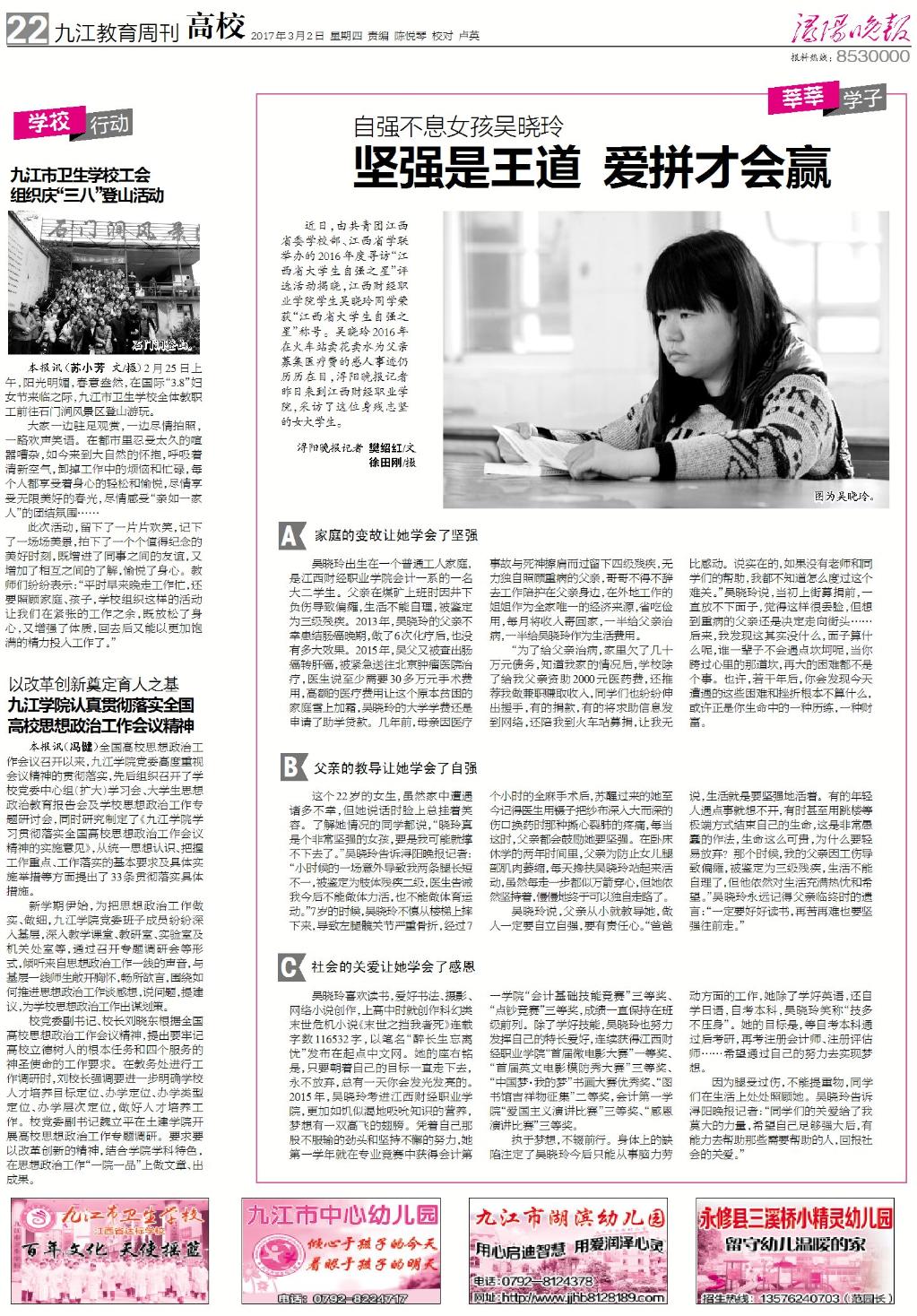 3月2日,《浔阳晚报》九江教育周刊以“自强不息女孩吴晓玲 自强是王道,爱拼才会赢”为题报道我院吴晓玲同学的事迹。
