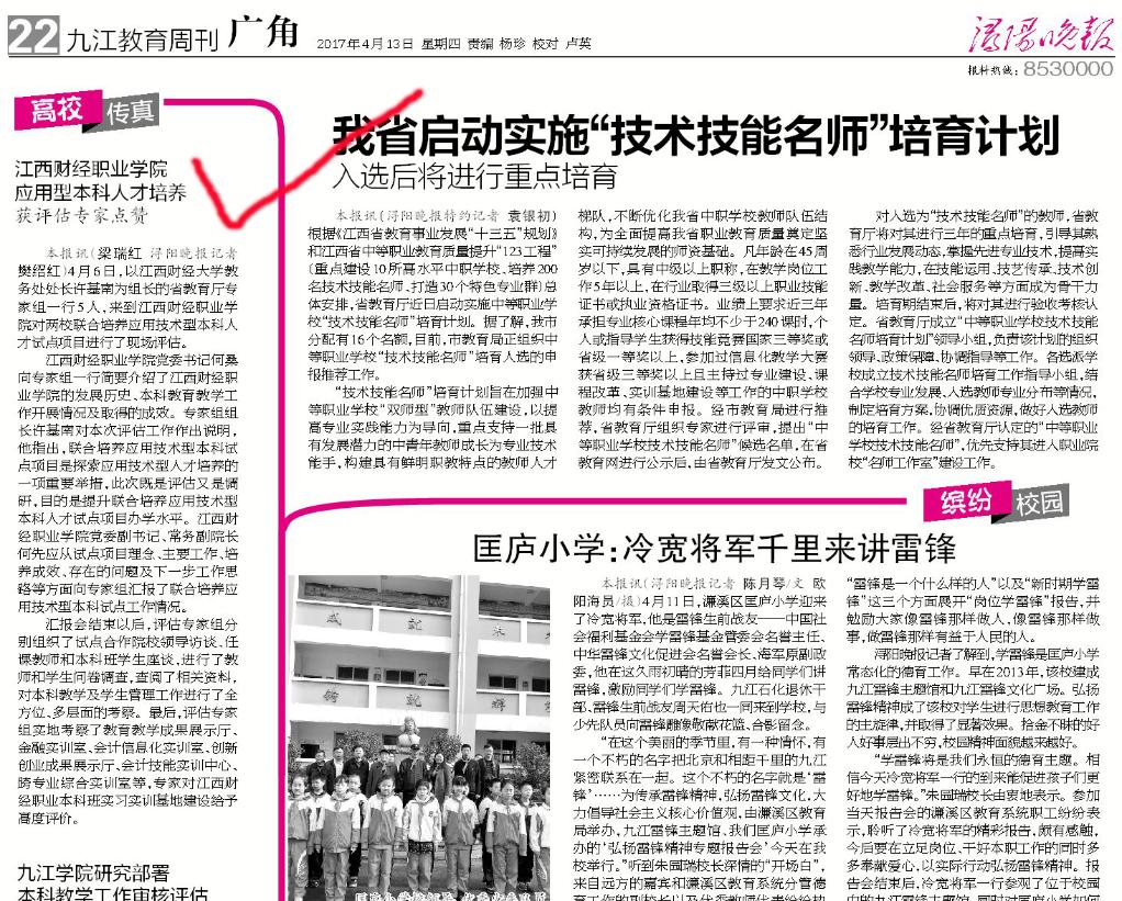 4月13日,《浔阳晚报》九江教育周刊报道省教育厅对我校应用型本科人才培养工作进行评估。