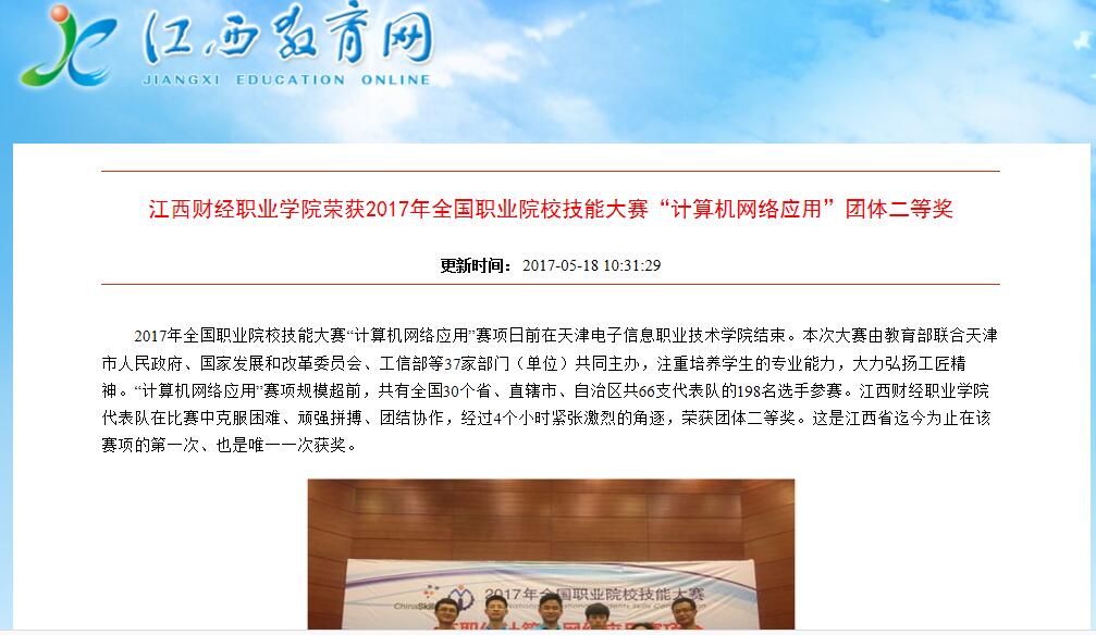 5月18日,江西教育网报道我校代表江西省参赛并荣获2017年全国职业院校技能大赛“计算机网络应用”团体二等奖。