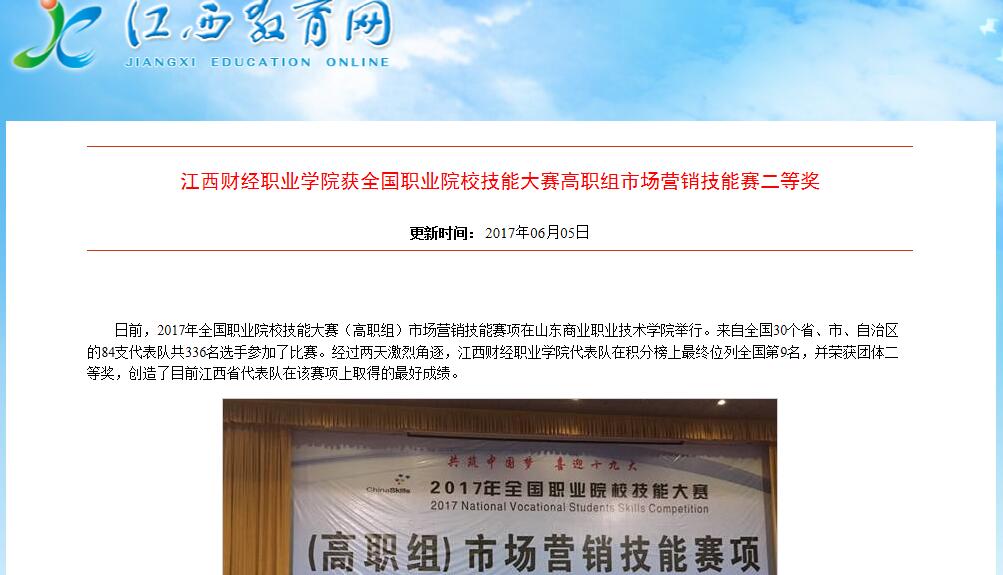 6月5日,江西教育网报道我院在2017年全国职业院校技能大赛高职组市场营销技能赛中荣获团体二等奖。