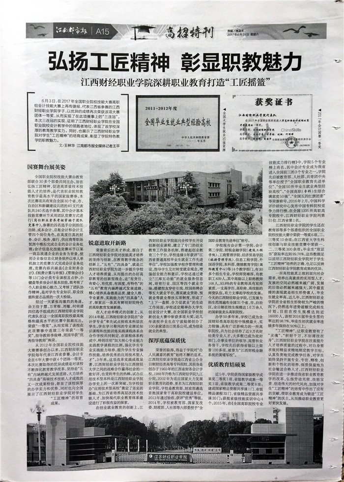 6月24日,《江南都市报》在A15版“高招特刊”栏目刊发《弘扬工匠精神 彰显职教魅力》一文,报道我校大力发展现代职业教育,弘扬工匠精神,在提升学生创新创业能力方面取得优异成绩。