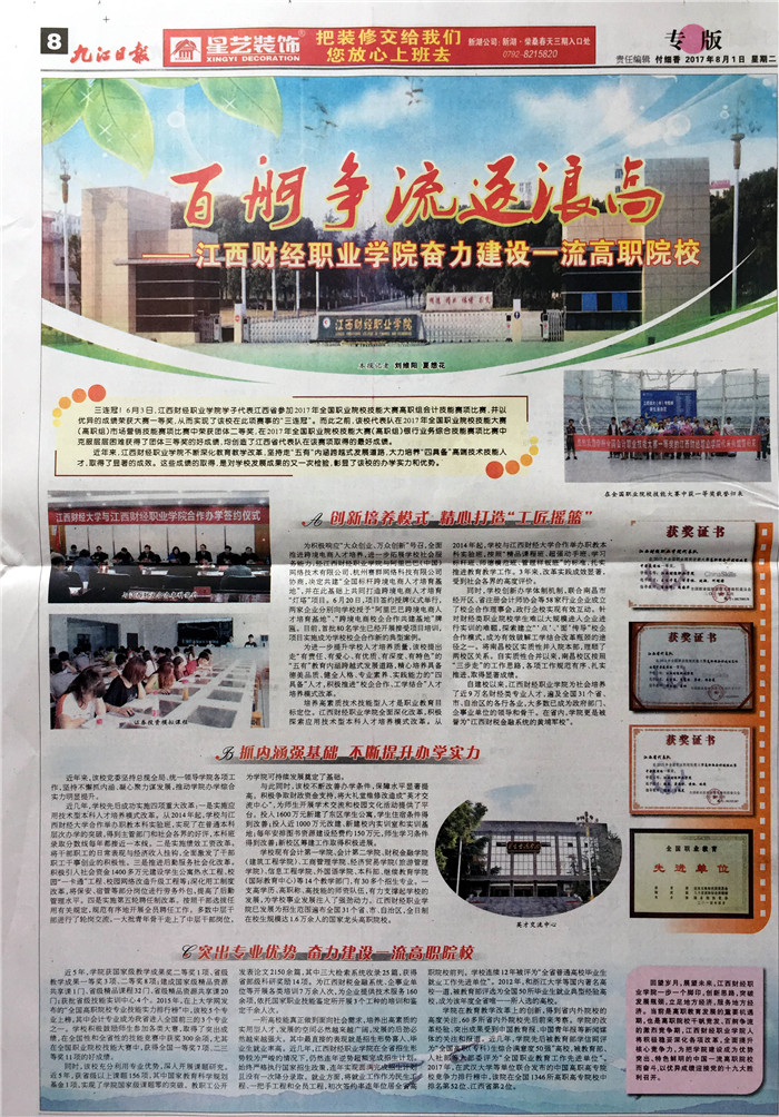 8月1日,《九江日报》在第8版刊发《百舸争流逐浪高——江西财经职业学院奋力建设一流高职院?!芬晃?,报道我校坚持走“五有”内涵跨越式教育发展道路,深化教育教学改革,在人才培养方面取得优异成绩。