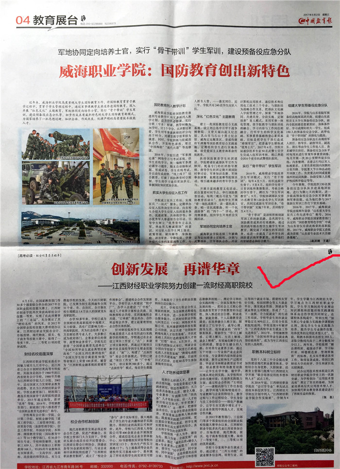 8月2日,《中国教育报》在04版“教育展台”专栏刊发《创新发展 再谱华章——江西财经职业学院努力创建一流财经高职院?!芬晃?,报道我校深化教育教学改革,人才培养工作取得显著成效。