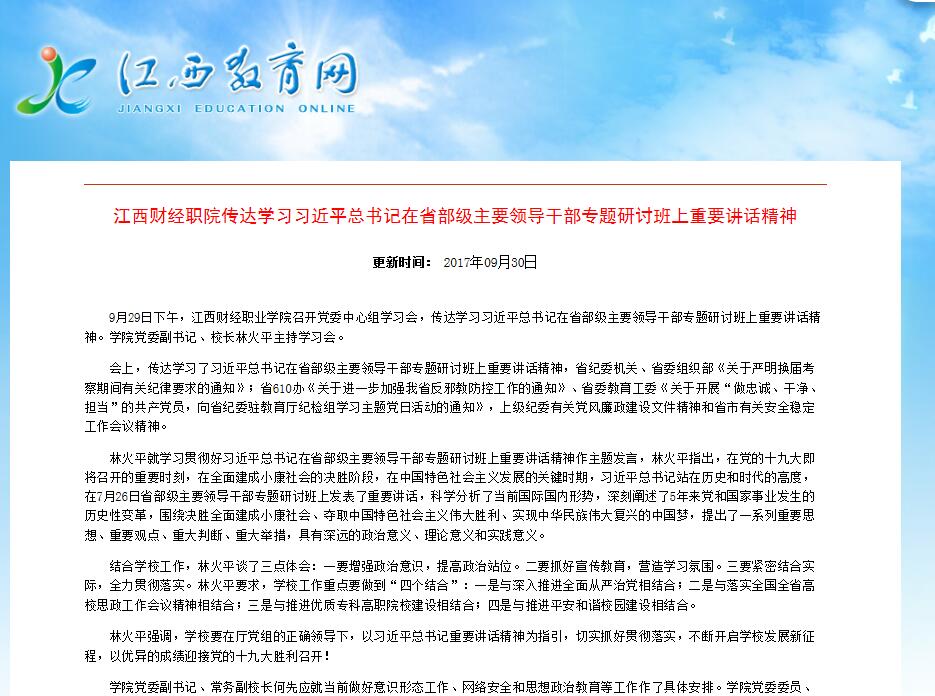 9月30日,江西教育网报道我校传达学习习近平总书记在省部级主要领导干部专题研讨班上重要讲话精神。